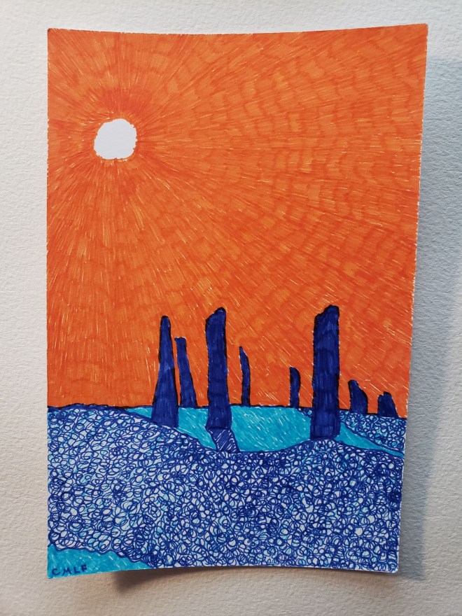 My wonderful cousin and his wonderful girlfriend gave me some mini art pens and tiny sketchbooks to take with me on the trip, which were perfect, allowing me to travel light without sacrificing materials I like to have with me wherever I go. They also inspired my gratitude project. I bought a bunch of blank postcards, and using those tiny pens, filled them with drawings of things I saw on my travels, then sent them as thank you cards for everyone who helped me celebrate my birthday in such style this year. I worked on them all summer, and finally put them in the mail today. These are the postcards: