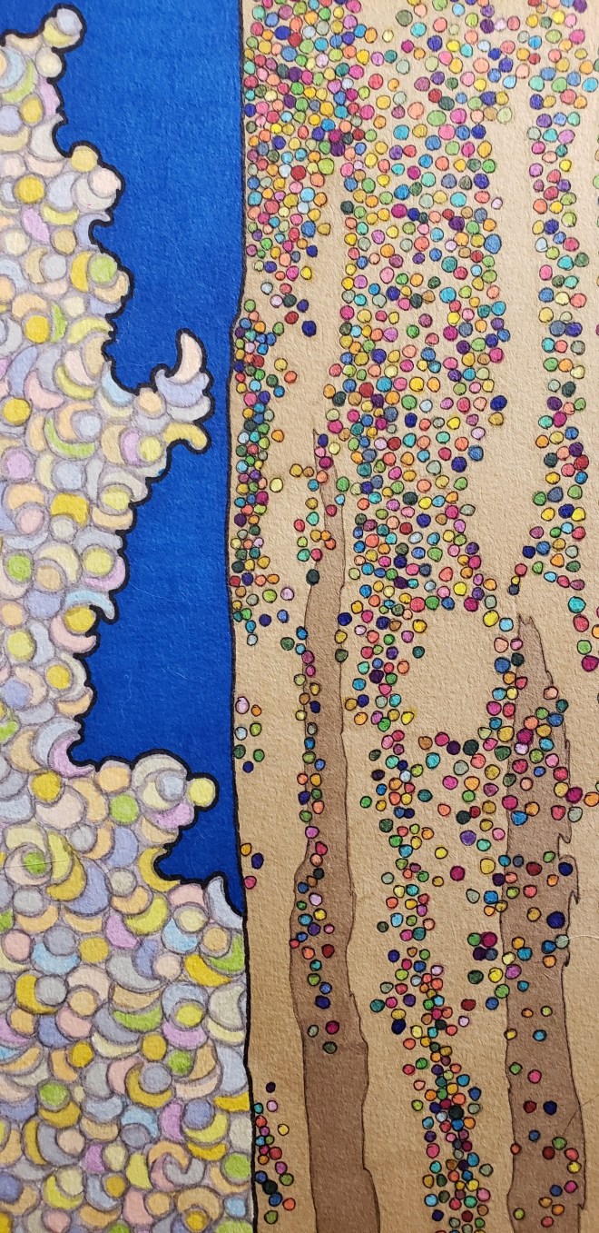 This was the first conceived of the three large pieces based on my travels of last spring. It’s from the Standing Stones of Stenness, part of the UNESCO World Heritage zone the Heart of Neolithic Orkney in the Orkney Islands in Scotland, home to 5,000-year-old villages, burial mounds, and standing stone rings. These particular standing stones are thought to be the oldest henge site in the British Isles. The stones that remain stand in what is now a sheep meadow by the shore. A pair of sheep were relaxing nearby when I was there and in the inlet across the way a dozen or more seals were sunning themselves, lolling on stones in the low tide like great beached balloons. Orkney was an absolute highlight of the trip and worth every bit of the extra effort it took to get up there. (It’s not exactly on the beaten path).