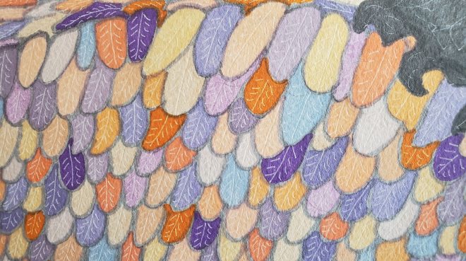 I think most people who draw a lot probably have certain subjects they tend to come back to over and over, whether it’s just in doodles or in bigger pieces. The things that have shown up most consistently both in the margins of my class notebooks and in my printmaking and other projects are snails, trees, birds, and angels. And here is one of those again.